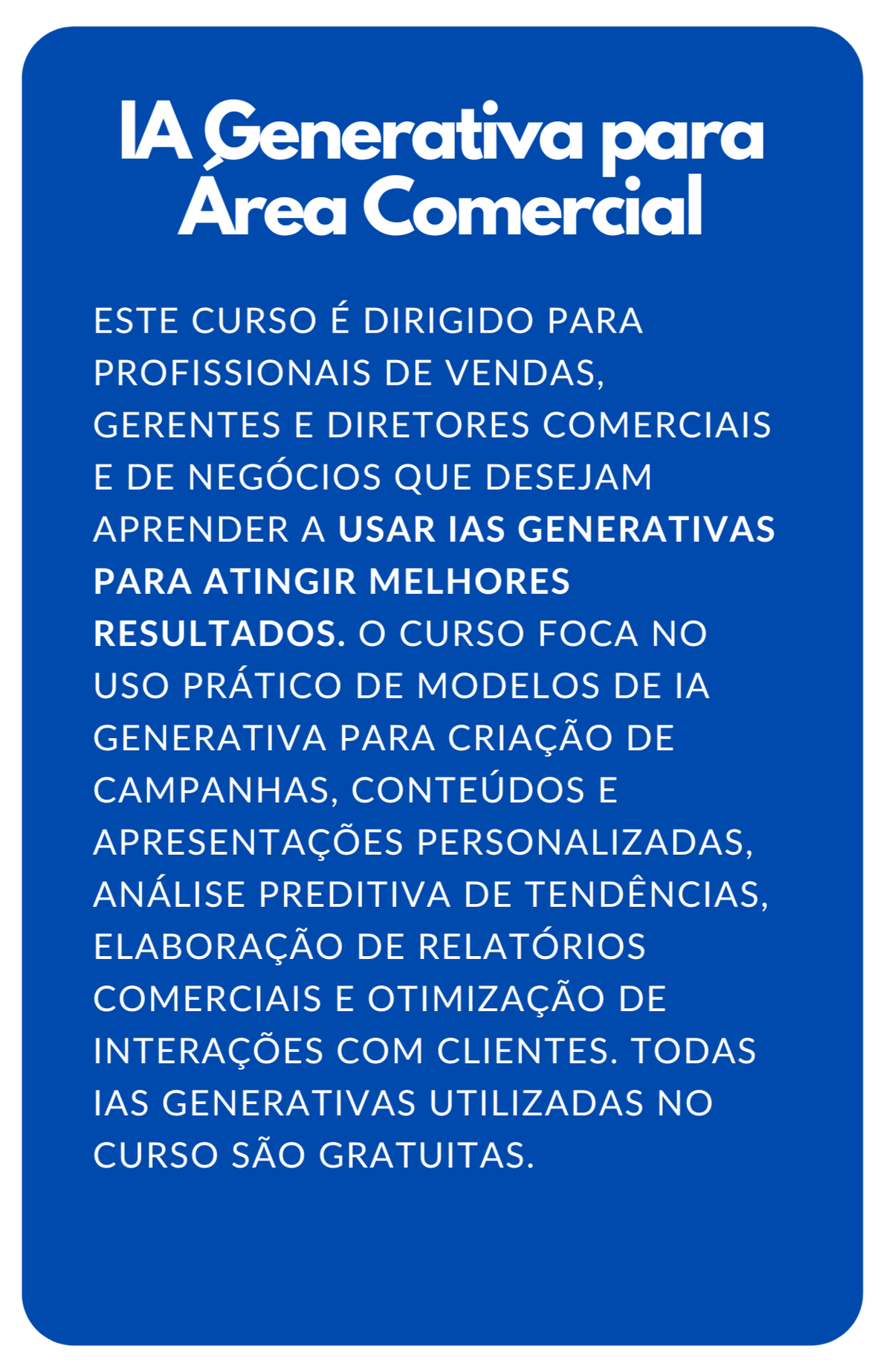 Os cursos da IA Online Academy foram concebidos para atender a um público amplo, de diferentes segmentos tais como vendas, marketing, recursos humanos, direito, administração entre outros. Nosso objetivo é descomplicar a Inteligência Artificial (IA) e para isso, usamos linguagem acessível, didática e atividades práticas que promovem o aprendizado gradual. A síntese desta abordagem é um conteúdo fluído, apresentado em quatro ou seis encontros de 1 hora e 30 minutos, sempre online live. Mas todas as aulas são gravadas para que os alunos possam assisti-las posteriormente. Ao final, os alunos recebem certificado e entram para "Comunidade IA Online Academy", para ampliar seu networking e receber novidades exclusivas sobre IA.